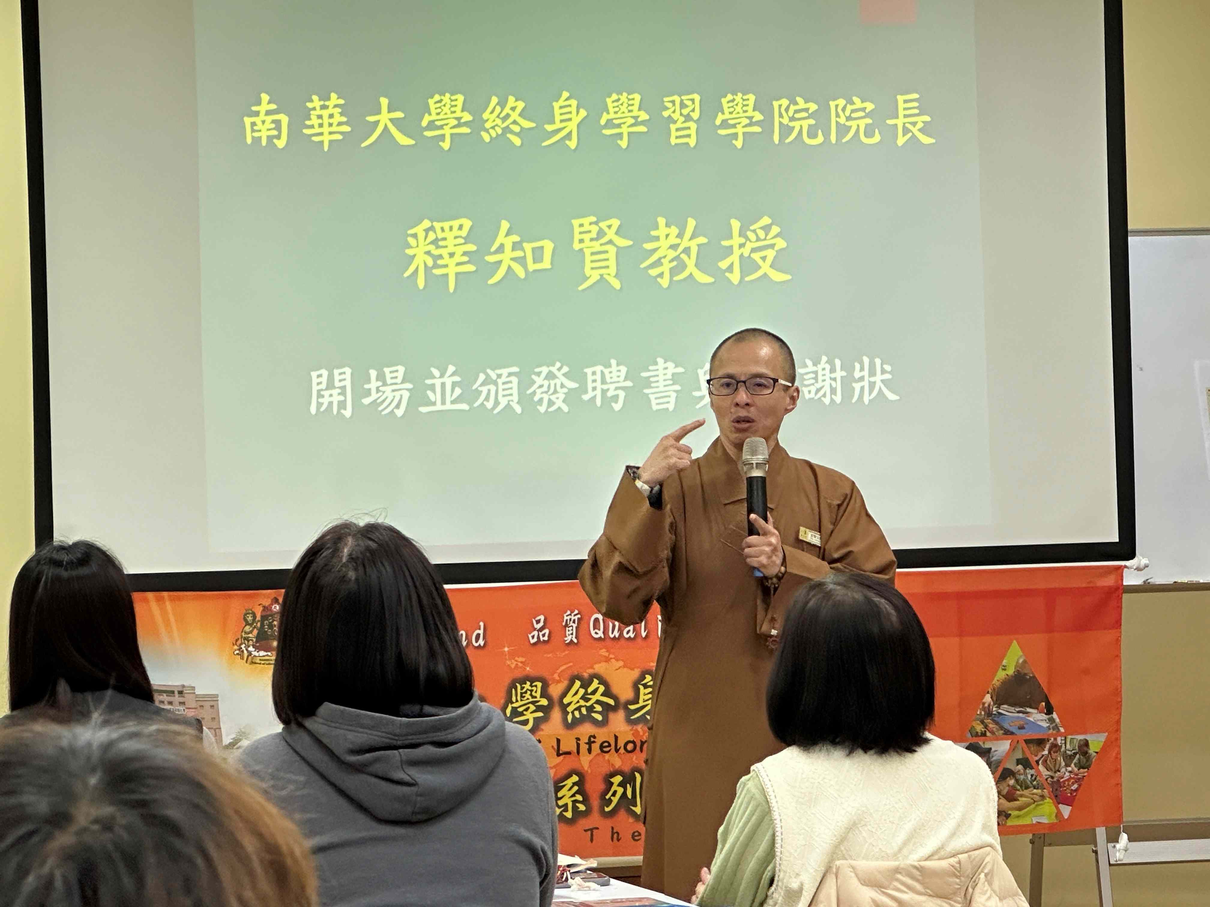南華大學終身學習學院院長釋知賢教授在開課致詞時指出,此次課程是針對讀報教育的師資專班,將讀報累積的知識融合桌遊的機制,落實佛法中的「方便法門。釋知賢強調,教育桌遊的關鍵不只在創意,更在「可被使用、可被推廣」的產品化能力。期待未來能把學員共同研發的桌遊推廣至國際佛光會、佛光青年及校園場域,擴大教育影響力。