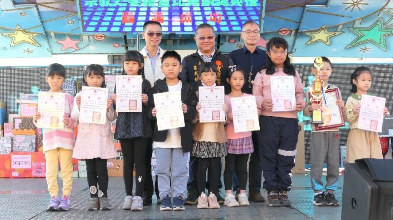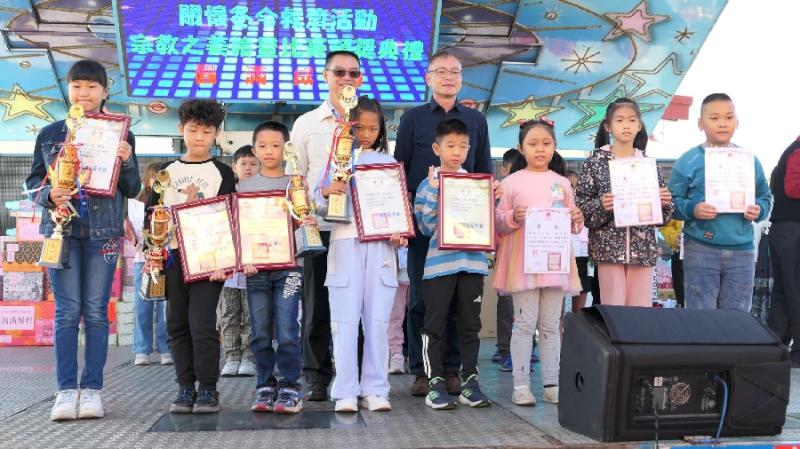 大會進行宗教之美繪畫比賽頒獎,評審老師從全縣534位參賽者中精選151位入選的優秀小畫家,國中組第一名民雄國中顏子恩、第二名民雄國中王綻捷、第二名大吉國中蕭湘穎、第三名新港國中董晏鈞。