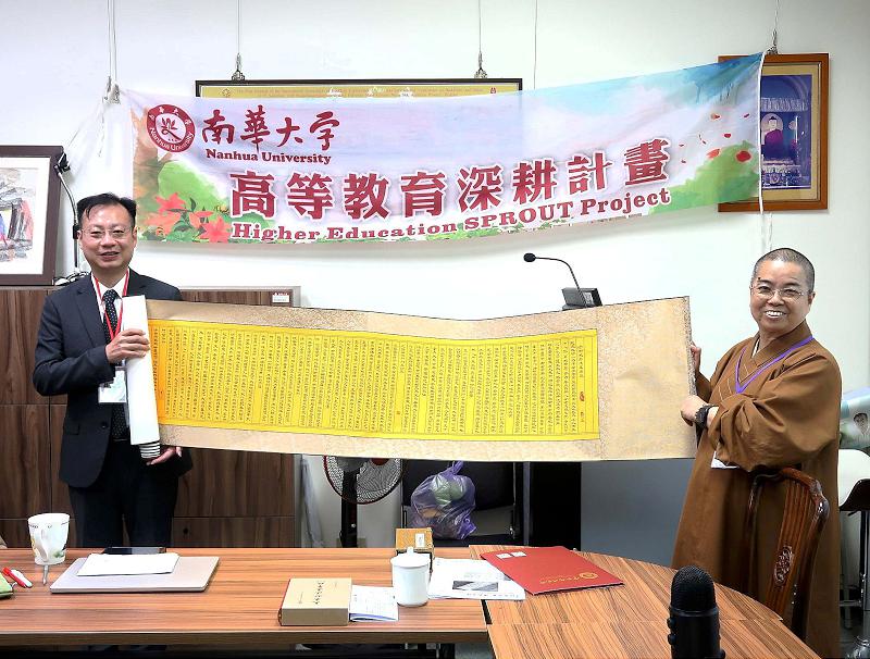 ►南華大學人間佛教學術講座邀請國立成功大學嚴瑋泓教授(左)詮釋《金剛經》,宗教所所長覺明法師(右)致贈金剛經卷軸。
