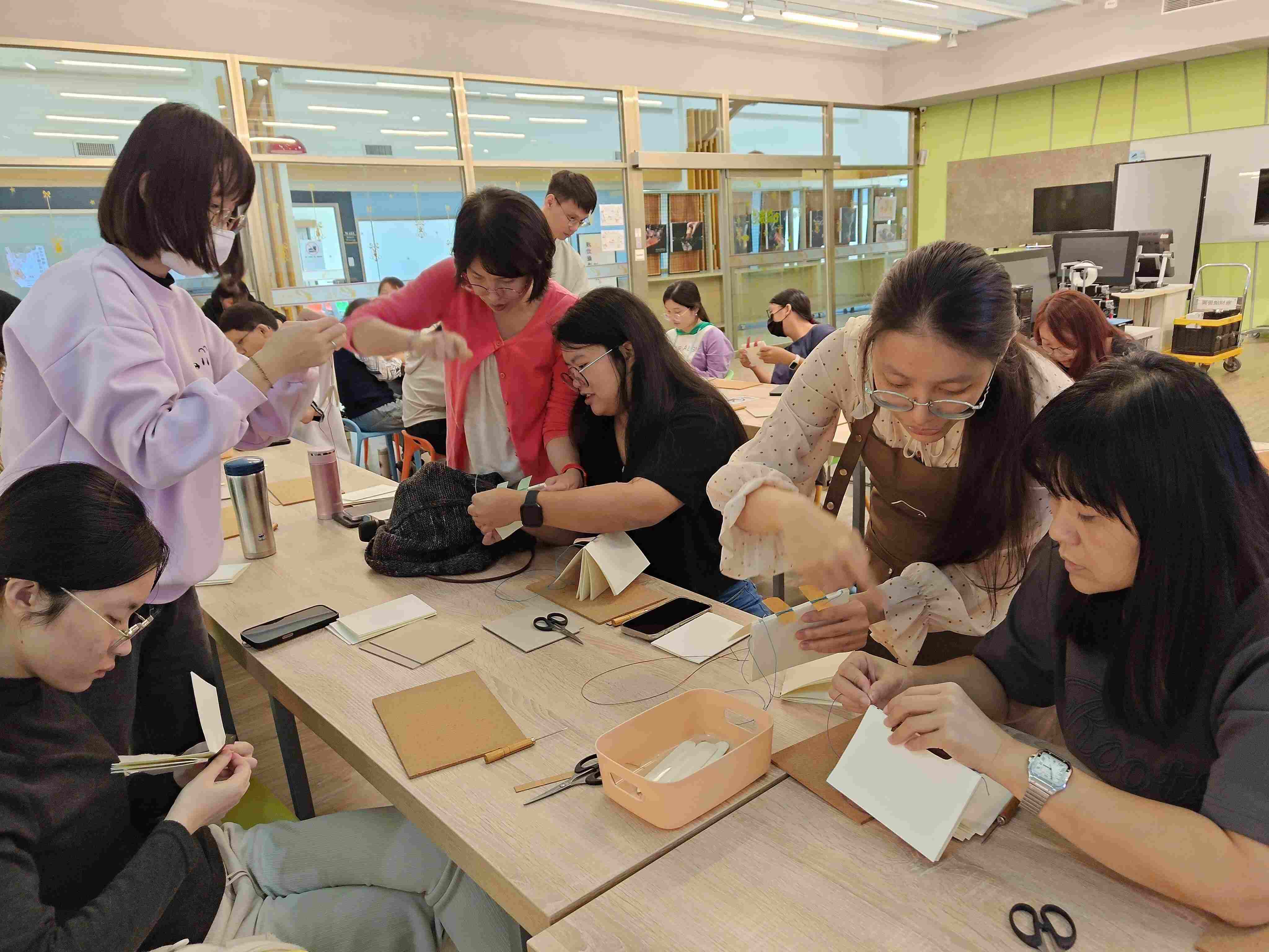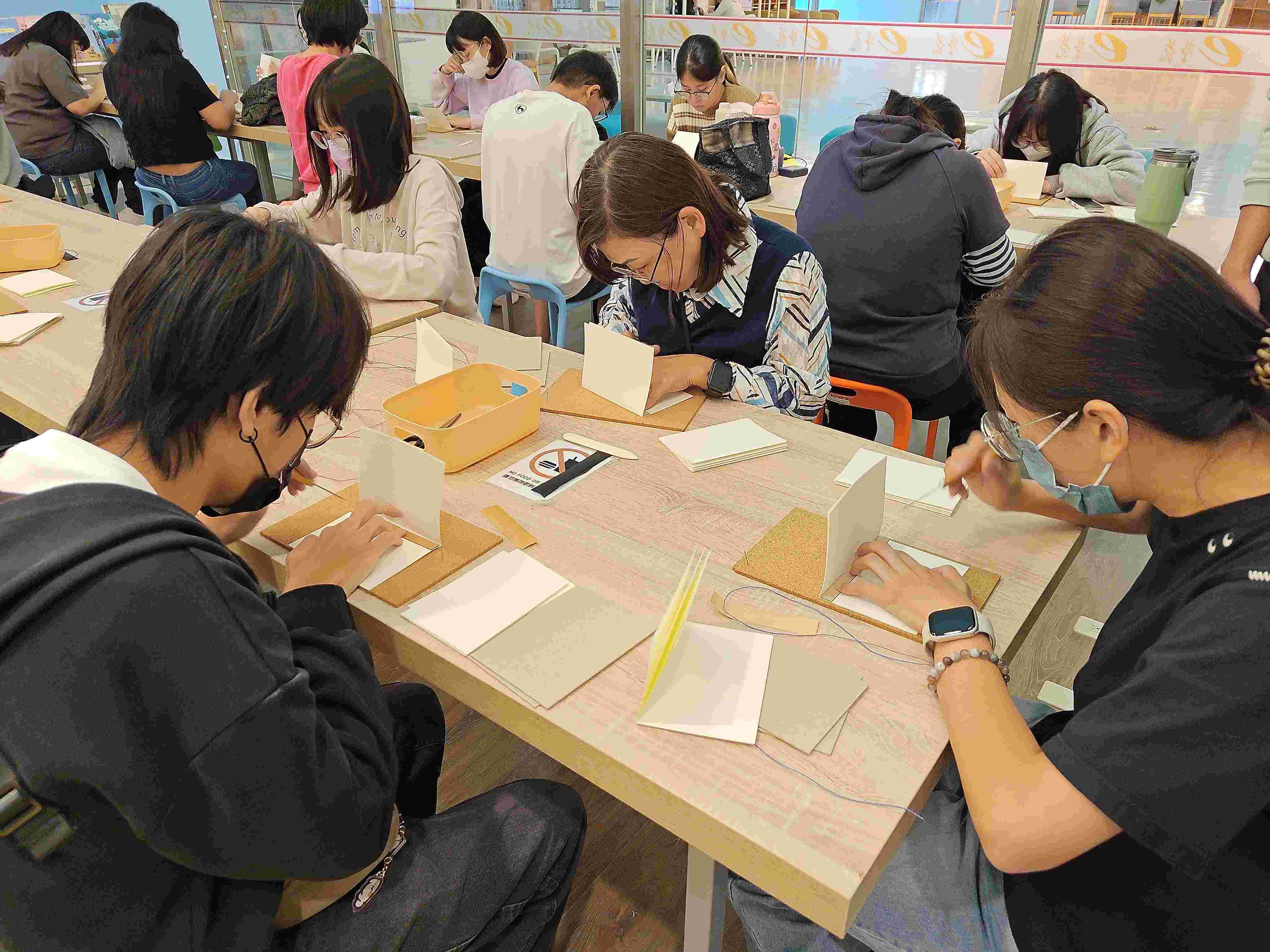 ►南華大學圖書館舉辦「USR繪本分享會與線裝手工書工作坊」,參加者專注縫製手工書,體驗創作樂趣。