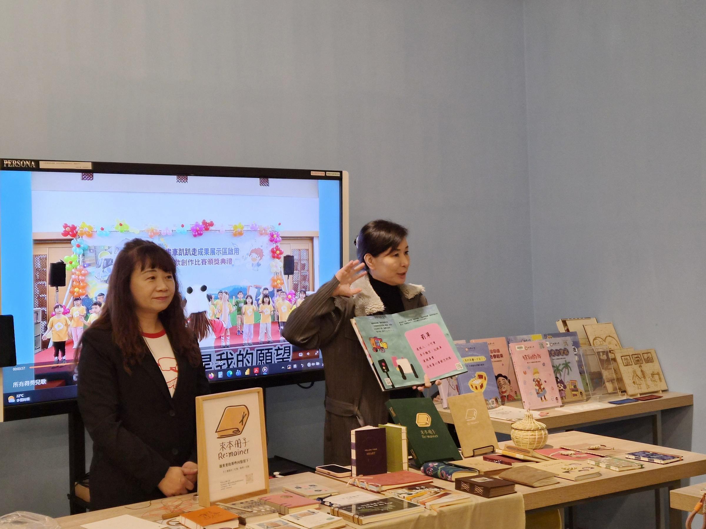 ►南華大學圖書館舉辦「USR繪本分享會與線裝手工書工作坊」,雲水書車USR計畫,參加者開心展示手作成品。