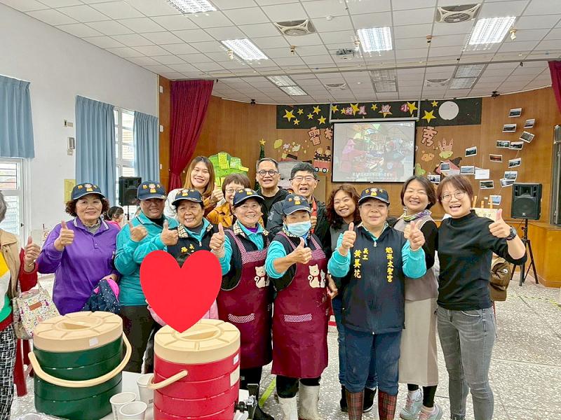 ►國科會人社計畫共同主持人呂欣怡教授(後排左2)、彭俊亨教授(後排左3)、嘉大人社團隊陳明聰院長(後排中)等師長與參與活動的太聖宮志工廚娘合影。