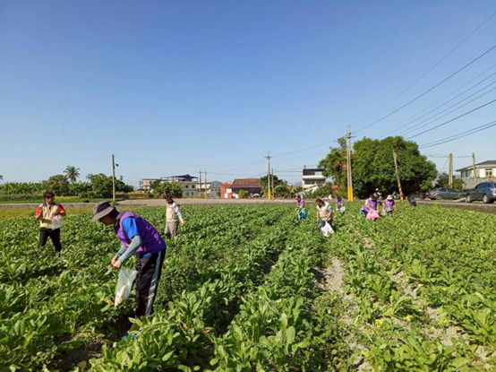►在廣闊農田中志工們專注採收白玉蘿蔔,展現團隊合作與向心力