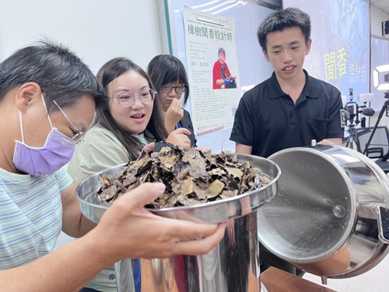 黃建雄老師透過演講及實際操作的方式,分享製作樟腦的過程,項場瀰漫著樟腦的芳香,除了利用蒸餾方式將樟樹葉製作樟腦之外,還做成香包,現成的老師們帶回家。樂齡大學的李清香大姊及嘉義南興國中的俞惠滿老師也特別來上這個課程。樂齡大學的李清香表示:「家中有一片樟樹林,剪下來的樟樹枝與樟樹葉都不知要如何利用,希望可以過這個課程學習樟腦製作。」蒸餾過的樹葉充滿香氣,也都被學員們打包帶回家,大家都滿載而歸。