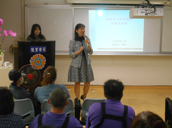 台南市佳里榮家為提升照服員及相關工作人員的法律認知,強化照護工作降低意外事故與爭議風險,特別辦理「工作人員執行服務工作法律常識」教育訓練,課程內容著重於照服員在執行工作及業務當中,不當的照護行為及未依規定執行業務可能衍生的法律及行政等責任,期使工作人員了解自身的權益與義務,做好服務照顧工作。