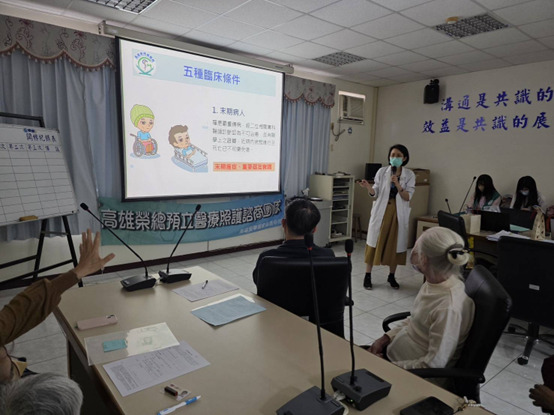 為讓長輩的人生旅程更安心,也讓家屬在面對醫療抉擇時不再徬徨,高雄榮總家醫科團隊特別至高雄榮家,溫暖辦理「預立醫療照護諮商(ACP)」服務,陪伴長者及其家屬一起思考生命後期的醫療選擇,並協助多位長輩、家屬與員工順利完成「預立醫療決定(AD)」簽署。活動中,高雄榮總家醫科黃資雅主任、楊汶翎護理師以溫柔、易懂的方式說明各種可能面臨的醫療情況,包括急救選擇、維生治療、人工營養等,團隊細心傾聽每一位長輩與家屬的想法,完整回應疑慮,讓醫療決定不再是令人焦慮的題目,而是一段能彼此理解、彼此靠近的對話。