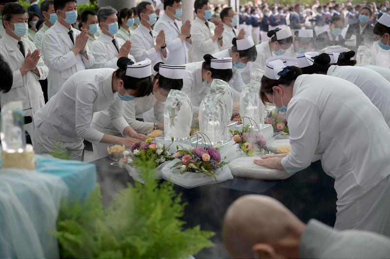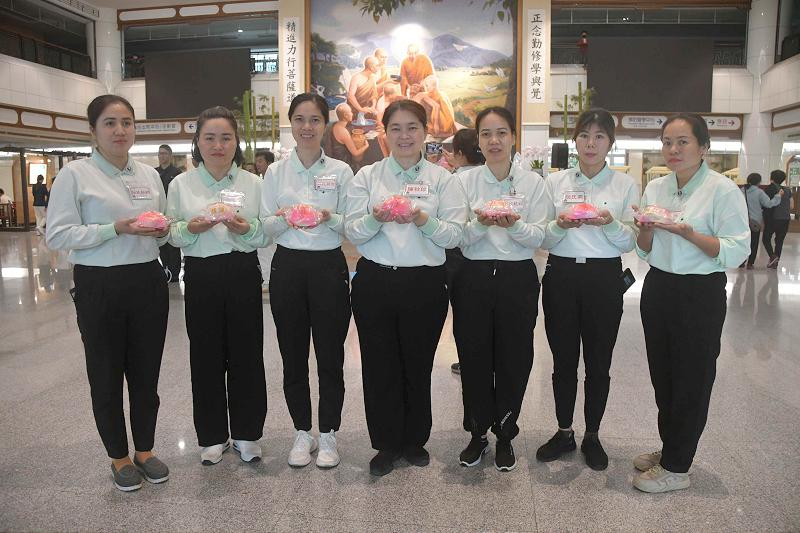病人家屬陳小姐的母親住院期間深受醫護人員的悉心照料,雖然母親目前處於半植物人狀態,他仍特地與丈夫和兒女一同前來浴佛,為母親祈求平安。醫院外包清潔人員謝女士本身是佛教徒,茹素超過四十年,得知醫院舉辦浴佛活動後,邀約先生、女兒一同前來參與。他分享道:「這樣的場合讓我感受到佛法的正能量。」