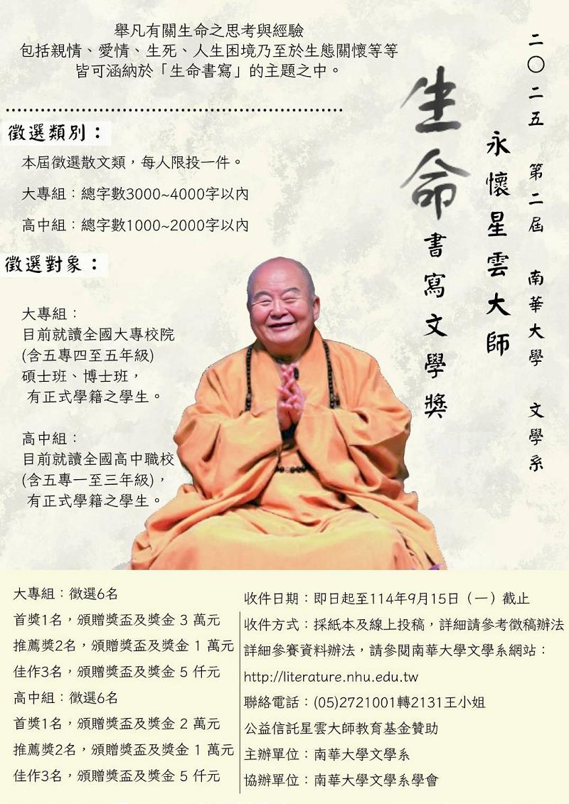為紀念星雲大師一生致力於「人間佛教」之闡揚,秉持著「以文化弘揚佛法,以教育培養人才,以慈善福利社會,以共修淨化人心」之宗旨弘法利生,更提倡生命永續,推廣做好事、說好話、存好心之三好精神,以實踐生命關懷,南華大學文學系特別舉辦「第二屆永懷星雲大師—生命書寫文學獎」,本活動由「公益信託星雲大師教育基金」贊助,將藉由獎勵生命故事之創作,呼應星雲大師以文學書寫人生,自覺而覺他,實踐生命教育之崇高理念。