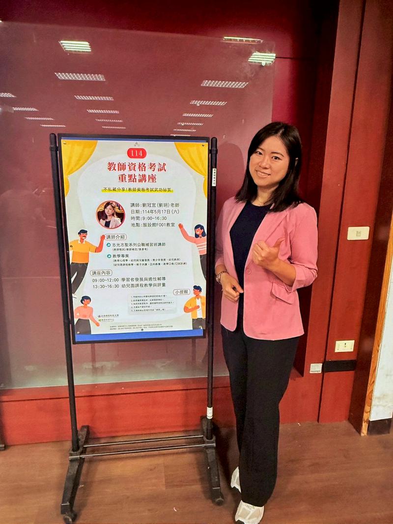 隨著114年教師資格考試進入倒數階段,台南應用科技大學師資培育中心張唯宸老師為協助應屆報考學生充實應考準備,特於5月17日(六)辦理「教師資格考試重點講座」,特別邀請專業輔考講師劉玥(劉冠宜)老師擔任主講,本次講座吸引數十位師資生參與,展現對教師資格考試的高度關注。