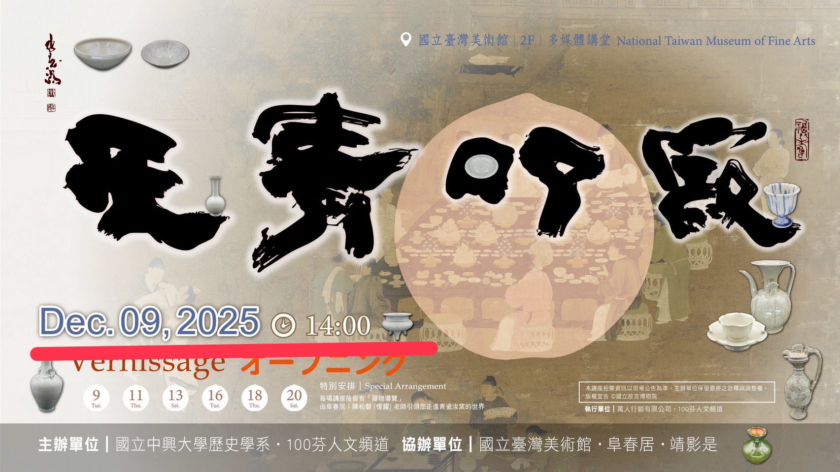 講座期間(12月9日至20日),於國美館多媒體講堂外,將同步首度在臺展出宋代〈文會圖〉中所描繪的「桃型盤」實物。此器造型優雅、工藝精絕,屬宋代皇室雅器,歷來備受海內外陶瓷界關注。此次展出之珍品,其稀有性與藝術價值甚至可與故宮典藏媲美,預料將吸引眾多陶瓷愛好者與民眾前來親睹風采。