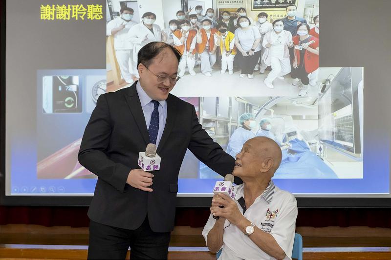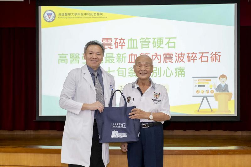 ►高醫引進最新血管內震波碎石術助七旬翁揮別心痛,高醫戴嘉言副院長(左)致贈紀念品給老翁