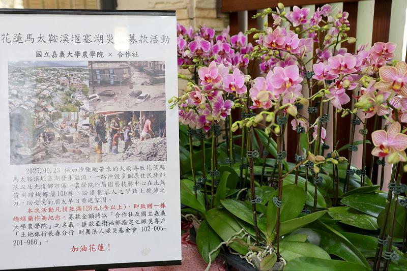花蓮光復鄉馬太鞍溪堰塞湖日前發生溢流,造成光復鄉重大傷亡及損失,全民同表悲痛。嘉義大學農學院園藝技藝中心與動物試驗場為積極響應花蓮賑災愛心捐款,無償捐出100株蝴蝶蘭與66瓶嘉大鮮乳,攜手熱心公益的嘉大員生消費合作社作為認捐平台,即日起歡迎至合作社捐款滿128元(含以上)即可領取1株蝴蝶蘭作為紀念,或認購1瓶嘉大鮮乳合作社即捐出90元(含以上),希望匯聚各方愛心,緩洪災之急難。