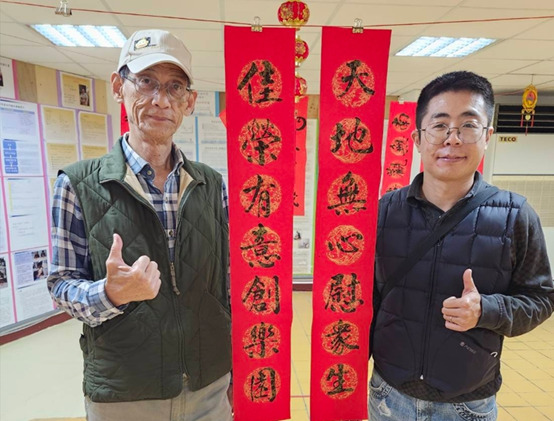 在老師們的引領下,長輩們寫出一副又一副寓意吉祥的馬年對聯,如「馬到成功」、「龍馬精神」、「萬馬奔騰」、「駿馬奔騰開新運」等等名句,還有住民感受佳里榮家的用心關懷,當場自創對聯:上聯「天地無心慰眾生」,下聯「佳榮有意創樂園」的詩句,真是才華洋溢!現場歡笑聲不斷,彼此分享作品、互相稱讚,氣氛溫馨熱絡。許多長輩表示,已經多年沒有親手寫春聯,能在老師陪伴下揮毫,感到既新鮮又開心,也讓春節的期待感更加濃厚。