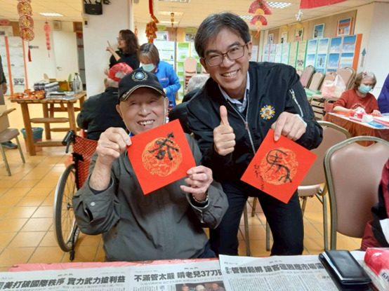 陳宗貴主任與住民開心合照,展現自寫春聯