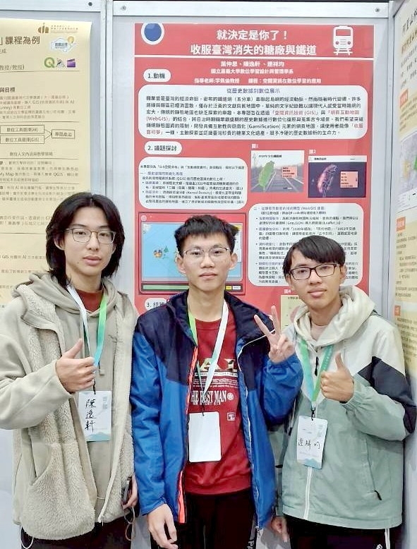 嘉大學生在數位人文跨域應用上亦表現不凡,展現嘉大在人才培育上的豐厚成果。數位系葉仲恩、陳逸軒、連祥均同學在課程引導下,以創意標題「就決定是你了!收服臺灣消失的糖廠與鐵道」榮獲凌霄獎銀獎,該研究巧妙運用GIS專業技術與AI工具,系統性梳理臺灣糖業鐵路變遷並建立互動地圖,將生硬史料轉化為具吸引力的圖鑑探索,為文史保存提供創新的數位敘事模式。數位系葉仲恩、朱書靚、湯又儒同學在數位人文專題實作中積極投入與創新思維,獲選為2025年優秀青年學者。