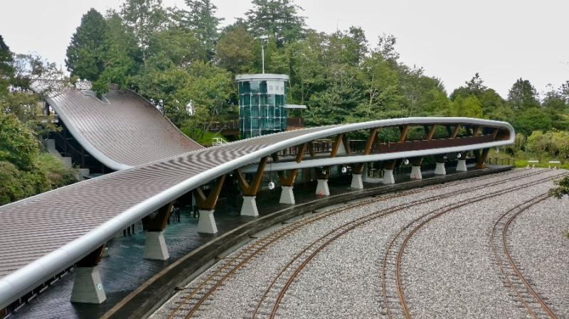 祝山車站改建工程,以「光明的起點」為發想,將雲霧繚繞山巒之意象巧妙融入屋頂設計,利用車站自然的地形坡度,從月台、前廳、主要階梯和觀日涼亭,彷若旅客穿越雲浪登上觀日平台之後,迎接日出破曉。