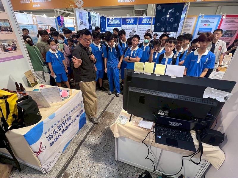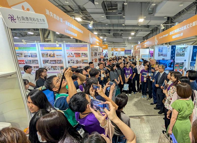 展位一開展便吸引大批民眾駐足,教育部長鄭英耀更親臨參觀並合影留念,現場氣氛熱烈。展品中,「府城光彩繡莊」的〈龍騰四海〉繡作成為焦點;另與日本知名皮件品牌「鞄いたがき(Itagaki)」跨國合作推出的三件刺繡皮件小物,以及由專技助理教授張繼榮先生與禾亞皮作坊攜手開發的「大龍頭肩背包」與「龍躍胸掛包」,展現傳統工藝結合當代設計的創新力。這些作品不僅體現「大學共繫 韌性創新」精神,更彰顯大學作為跨域橋樑、推動多方合作的重要角色。同時,本計畫透過「全球刺繡研究發展中心」所開設課程的學生精緻作品也於展場亮相,兼具美感、功能與社會責任,進一步展現人才培育與工藝創新的成果。