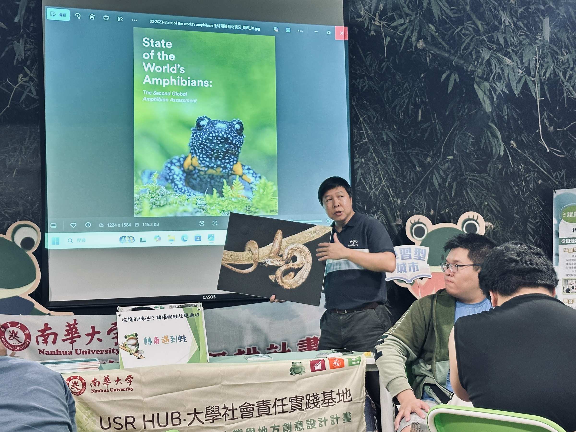 ►南華大學辦理工作坊,由旅遊管理學系副教授許澤宇解說諸羅樹蛙與兩棲類生態保育議題。