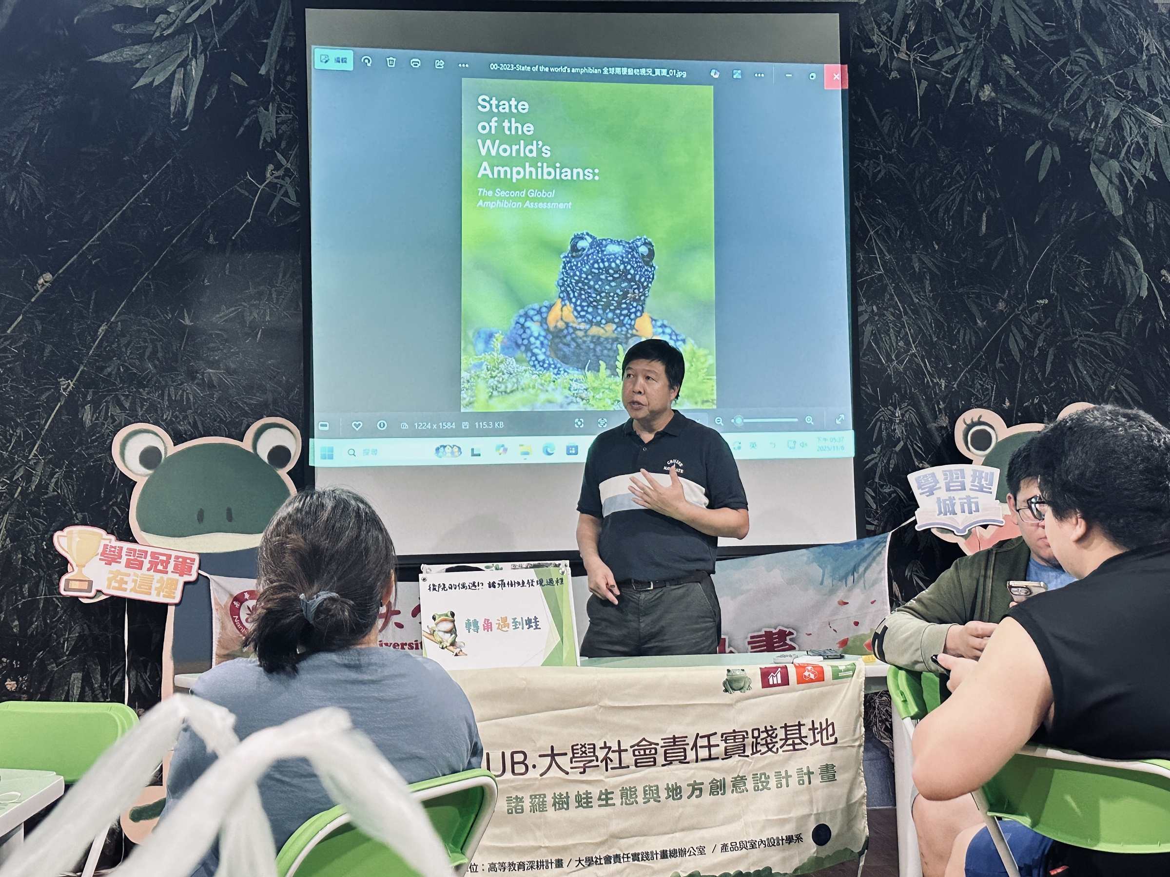 ►南華大學辦理工作坊,由旅遊管理學系副教授許澤宇解說諸羅樹蛙的保育,以培養學生具備人文關懷與生態保育素養。