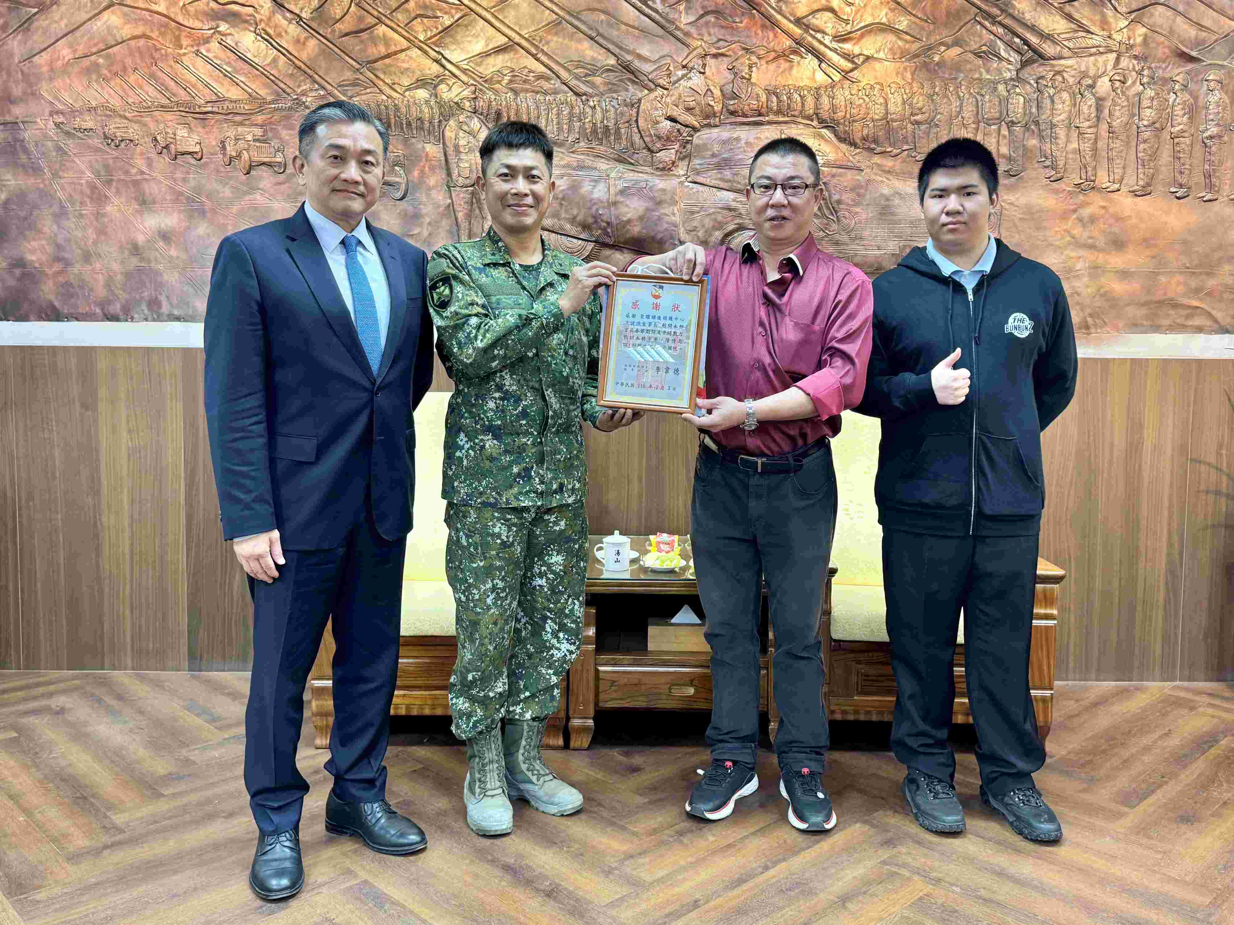 台南市軍人服務站王健源顧問,為感謝國軍官兵執行戰備任務之辛勞,於春節前夕(3日)辦理敬軍慰問活動,由台南市軍人服務站劉可雲站長及台南市後備憲兵荷松協會李健成理事長、汪榮進秘書長、戴國隆常務理事等人陪同,前往陸軍砲兵訓練指揮部湯山營區實施慰勞,並致贈陸軍砲訓部及臺南憲兵隊春節慰勞金,以鼓舞官兵士氣。