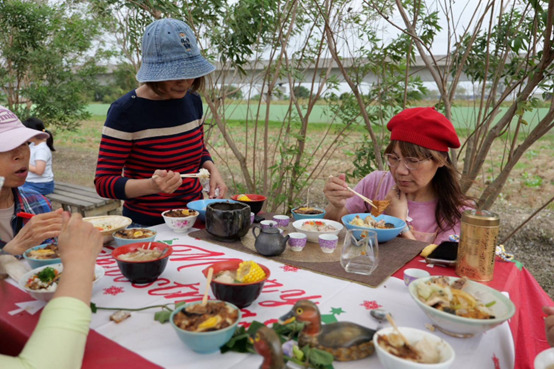 中午的「鄉村割稻飯」於後壁合鴨藝術園地進行。在地以米為主角的一桌家常料理,沒有華麗的擺盤,卻充滿濃濃的人情味與土地味。企業員工圍坐在田邊的戶外棚下,在冬日陽光中享用農村風味餐,笑聲與聊天聲交織出暖暖的田園氛圍。