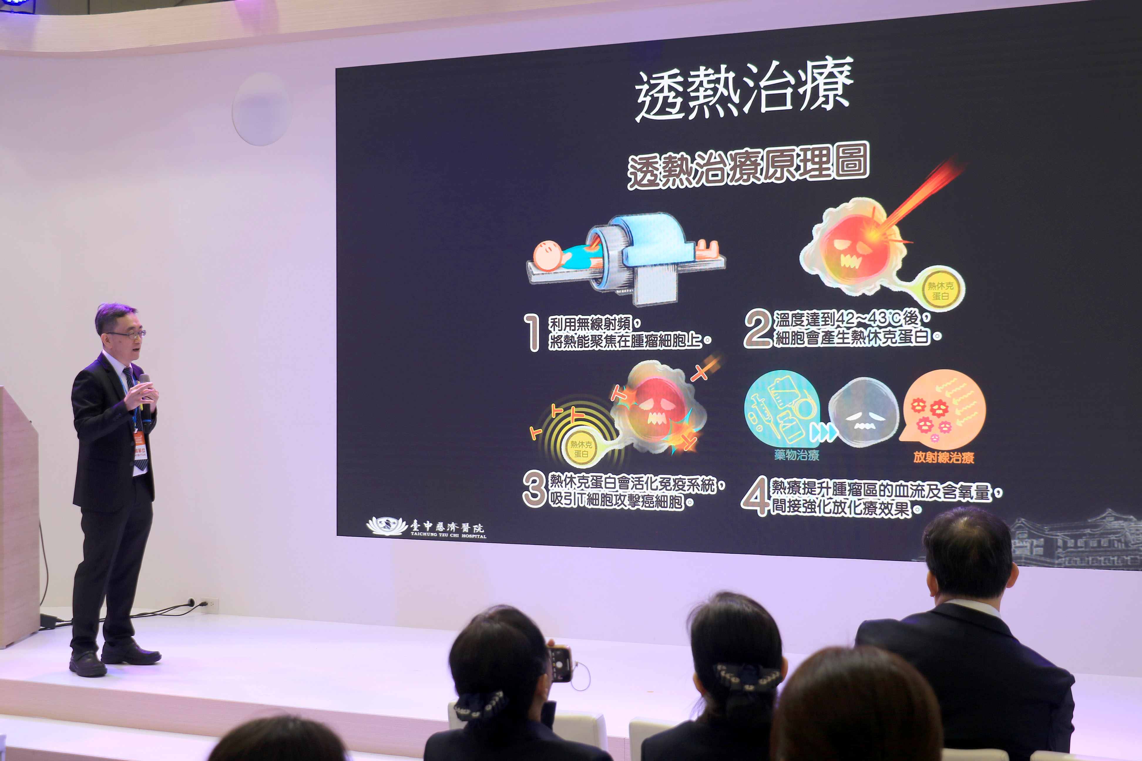 台中慈濟醫院外科部副主任方佳偉6日於台灣醫療科技展分享「有溫度的抗癌」,介紹高階熱治療中心「腹腔溫熱化療」與「透熱治療」。方佳偉說明,透過溫度破壞癌細胞,甚至產生活化免疫、促進血液循環,間接提高化學藥物治療與放射線治療效果。他強調,台中慈濟醫院的人文關懷,增加病人心靈暖度,讓身心都能有溫度抗癌。