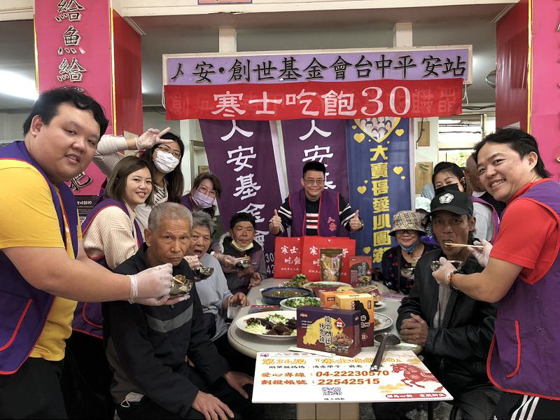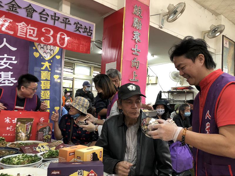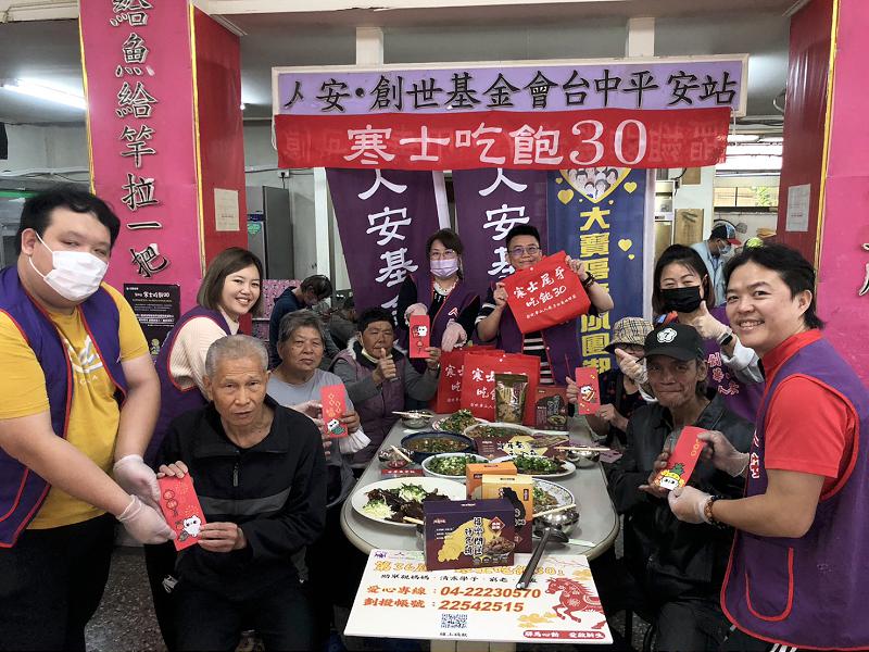 為讓寒士在最冷的節氣中吃得飽、撐得住,人安基金會於1月20日在台中平安站舉辦「圍爐禦寒」活動,提前準備「寒士吃飽30」七道年菜,包括開運好食雞、琥珀獅子頭、古早香芋飯、福運秋刀魚、御品佛跳牆、椒鹽素拚香及精選豬肉鬆,讓寒士提前感受圍爐的溫度。一道道熱食上桌,不僅溫暖身體,也撫慰人心。